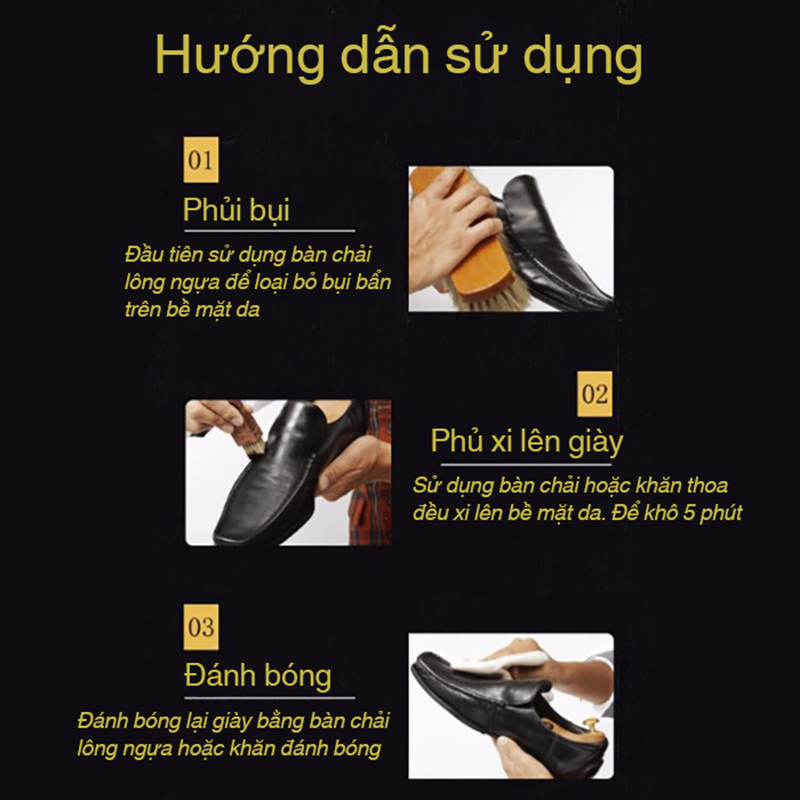 • BƯỚC 5: Đợi khoảng 3-5 phút để kem thẩm thấu vào da. Sau đó, sử dụng bàn chải đánh giày lông ngựa để đánh đều kem và làm bóng da giày. Điều này giúp kem thẩm thấu sâu hơn và mang lại độ bóng cho giày.