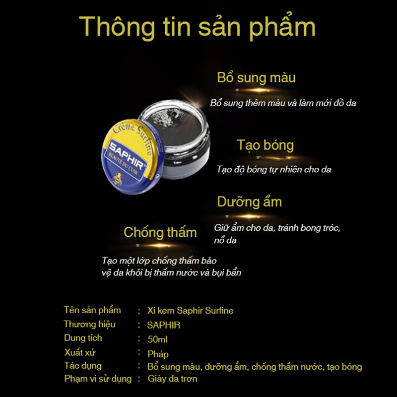• Lưu ý: Trước khi sử dụng xi kem Saphir, hãy đảm bảo chọn đúng màu sắc của da, đọc kỹ hướng dẫn sử dụng và tuân thủ hướng dẫn sử dụng của nhà sản xuất để đạt hiệu quả tốt nhất và tránh gây hại cho đồ da.
